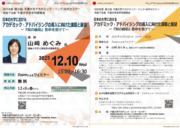 2025年度第3回アカデミック・リンク/ALPSセミナー・令和7年度 千葉大学全学FD研修会「日本の大学におけるアカデミック・アドバイジングの導入に向けた課題と展望―『知の総和』答申を受けて―」 日付2025.12.10(水) PM 03:00 – PM 04:30 詳 細:https://alc.chiba-u.jp/seminar/alps/2025_03.html 開催方法:Zoomを使用したウェビナーによる開催 開催日時:2025年12月10日(水)15:00‐16:30 参 加 費:無料
